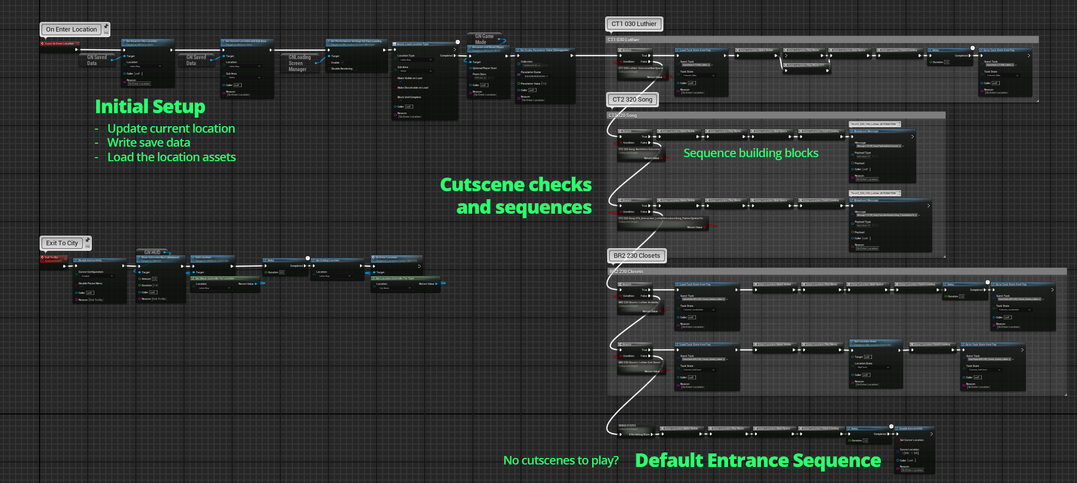 The solution? Embrace the chaos. We chopped up the transition sequencer into a bunch of reusable single behaviors, and made each individual location in charge of how it starts up and exits. Each location has a default entrance and exit sequence that it runs, and for each custom behavior or cutscene that we want to run, we check if we need to run it, and then set up and play the cutscene instead.