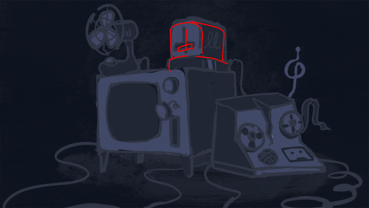 Later in the act is an interaction with electronic devices. We decided to go 2D animation on this rather than 3D, figuring we could get more control of and whimsy out of the artwork this way. Here is a near-finished loop of a toaster.